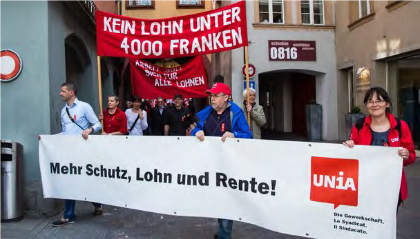 Zu Beginn der Mindestlohnkampagne wurde versucht, die ArbeiterInnen und Jugend zu mobilisieren. Mit Schulpodien, Quartierkomitees und Mobilisierungen am Arbeitsplatz hat die Unia einen wichtigen Grundstein gelegt, den es weiter zu verfolgen gilt. Solche Basisarbeit ist energieaufwendig und bringt nicht unbedingt kurzfristige Erfolge, weshalb sich die Gewerkschaftsspitze enttäuscht wieder ihrem bezahlten Apparat zuwandte, der in der Schlussphase dann die fehlende Mobilisierung auf der Strasse ersetzte. Auch Unia-Co-Präsidentin Vania Alleva beklagte sich, es hätten sich für die Kampagne zu wenige unterbezahlte Angestellte gefunden, welche sich öffentlich für die Kampagne aussprachen. Dies zeigt eben deutlich, dass die Gewerkschaften in den Betrieben ungenügend verankert sind. Die Aufbauarbeit von Betriebsgruppen und der Organisierungsgrad der Gewerkschaften in den Tieflohnbranchen ist essentiell für ihre Kampfkraft – sowohl in wirtschaftlichen wie auch politischen Kämpfen. An der SGB-Delegiertenversammlung wurde über die weitere Ausrichtung gesprochen. Man wolle sich weiter auf die Tiefstlöhne, vor allem auch die Lohndiskriminierung der Frauen, konzentrieren. Diese will man durch mehr und bessere Gesamtarbeitsverträge bekämpfen. Wie jedoch will man den nötigen Druck auf die Arbeitgeber aufbauen, um solche Lohnforderungen zu erreichen? Durch unermüdliche Basisarbeit in den Betrieben? Durch offene und transparente Verhandlungen mit den Patrons, wo man die Belegschaft miteinbezieht und ihre Interessen klar denen ihrer Ausbeuter gegenüberstellt?