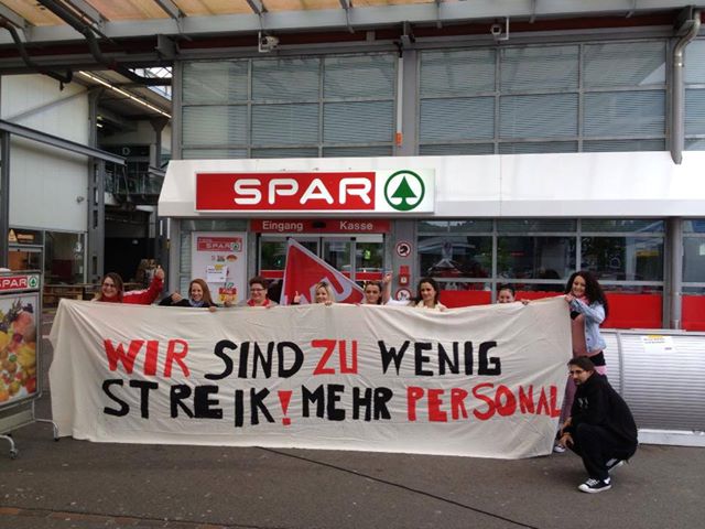 vielen Überstunden. Gleichzeitig sind die Löhne mit 3600 Franken für eine Vollzeitstelle sehr tief. Doch die Angestellten sind kämpferisch gestimmt und lassen sich die unhaltbaren Arbeitsbedingungen bei Spar nicht mehr länger gefallen. „Seit 13 Jahren arbeite ich nun schon hier und habe kein einziges Mal eine Lohnerhöhung bekommen. Im Gegenteil: Vor allem in den letzten 5 Jahren wurde der Druck auf uns Angsestellten zunehmend schlimmer.“, so eine der Streikenden.