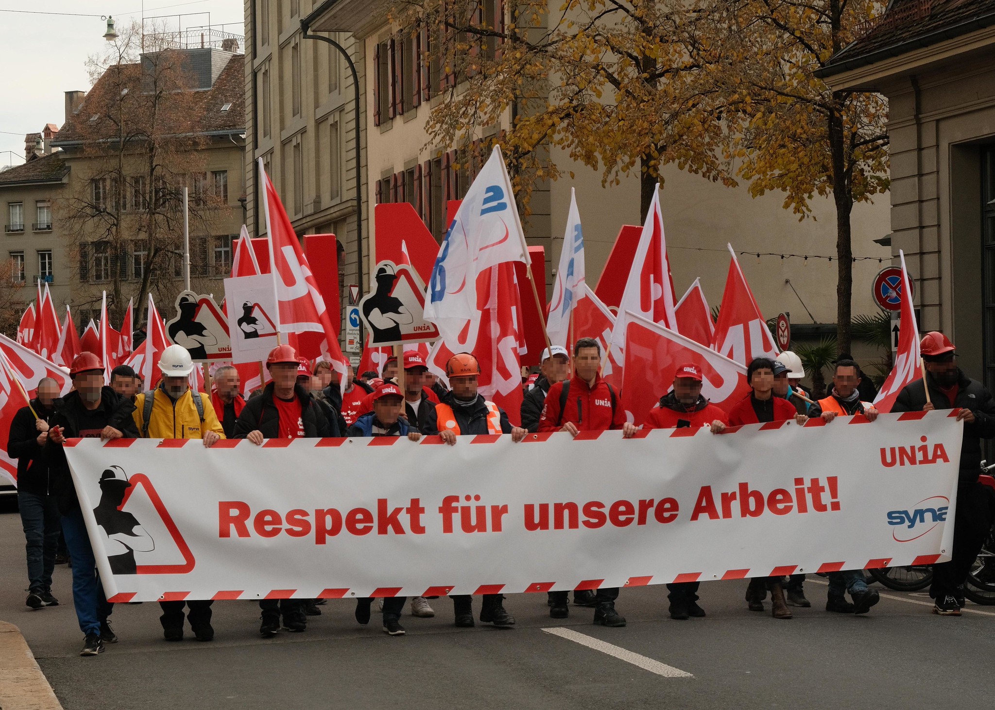 Im Rahmen der Verhandlungen über den neuen nationalen Gesamtarbeitsvertrag (LMV) legten die Berner Bauarbeiter am 31. Oktober ihre Arbeit nieder. Rund um die Stadt Bern standen die Baustellen still. Nach einer Streikversammlung zogen 800 Demonstranten durch die Innenstadt. Die Kommunisten der RKP waren an den Streikposten, drückten ihre Solidarität aus und diskutierten mit den Streikenden über den Weg vorwärts.