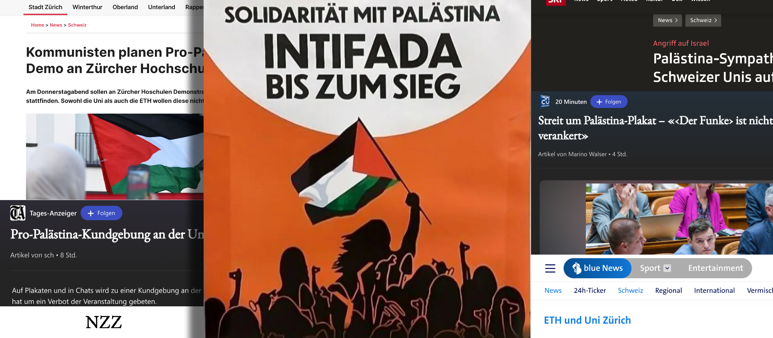 Die grössten bürgerlichen Medien der Schweiz – 20 Minuten, Tagesanzeiger, NZZ, Weltwoche – haben zur Hetzjagd gegen uns Kommunisten geblasen. Sie schiessen gegen uns, weil wir uns in Solidarität mit dem palästinensischen Volk organisieren.