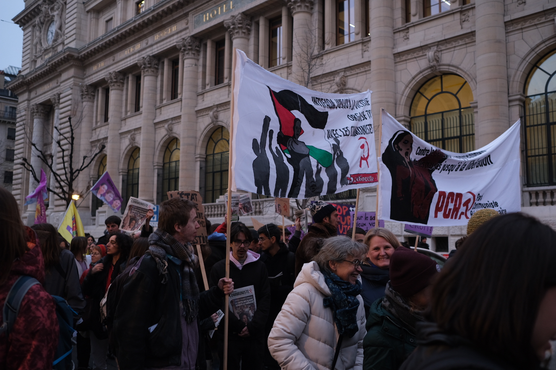 Wir alle hatten uns sehr darauf gefreut, unseren Kampfgeist zu zeigen und unsere revolutionäre Agenda für die Emanzipation der Frau einzubringen. Wir hatten «Gegen Sexismus und Unterdrückung, Klassenkampf bis zur Befreiung»-Transpi sowie unser Palästina-Transpi dabei. Praktisch alle Leute, mit denen wir sprachen, stimmten zu, dass das gegenwärtige System aktiv an der Unterdrückung der Frauen beteiligt ist. Trotzdem wurden den rund 1’500 Teilnehmern in den Reden der Führung keine konkreten Lösungsvorschläge zum Sturz dieses unterdrückerischen Systems angeboten. Wir waren die einzigen an der Demo, die direkt mit den Anwesenden sprachen und ihnen einen effektiven Weg vorschlugen, um für die Befreiung der Frau zu kämpfen. Deshalb nahm Emma, eine Genossin, gegen Ende der Demonstration, als die allgemeine Energie nachliess, das Megaphon in die Hand und hielt mitten auf dem grossen Platz im Stadtzentrum (Plainpalais) eine Rede, um zu zeigen, dass die Demonstration zwar vorbei war, der Kampf und unser Kampfgeist es aber nicht waren. Mehrere Leute blieben stehen, um ihr zuzuhören und dann mit uns zu sprechen.