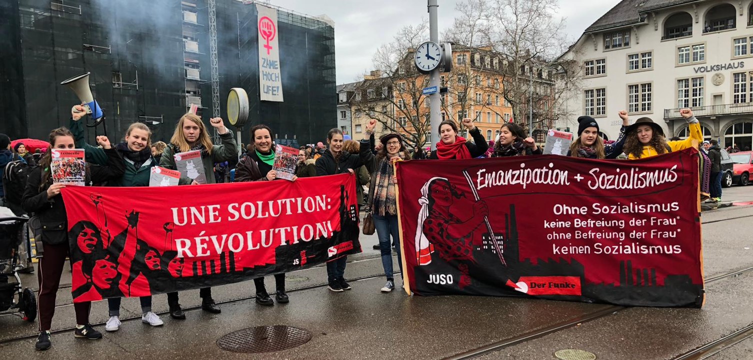 Am Samstag nach dem internationalen Frauenkampftag, dem 8. März, versammelten sich rund 1000 Frauen (Männer durften leider nicht mitlaufen) um 13:30 auf dem Hechtplatz in Zürich. Trotz des Regens waren alle Frauen bereit für ihre Rechte zu kämpfen. So war die Stimmung bereits vor der Demo sehr kämpferisch und in den Reden auf Deutsch, Spanisch und Kurdisch wurde deutlich, dass viele Frauen bereit sind, für eine gleichberechtigte Welt einzustehen. Der Demonstrationszug war laut und es war eine deutliche Einheit zu spüren. Wir forderten Gleichberechtigung zwischen Frauen und Männern und Lohngleichheit. Themen waren auch der Sexismus und die Care–Arbeit sowie die Solidarität mit Afrin.