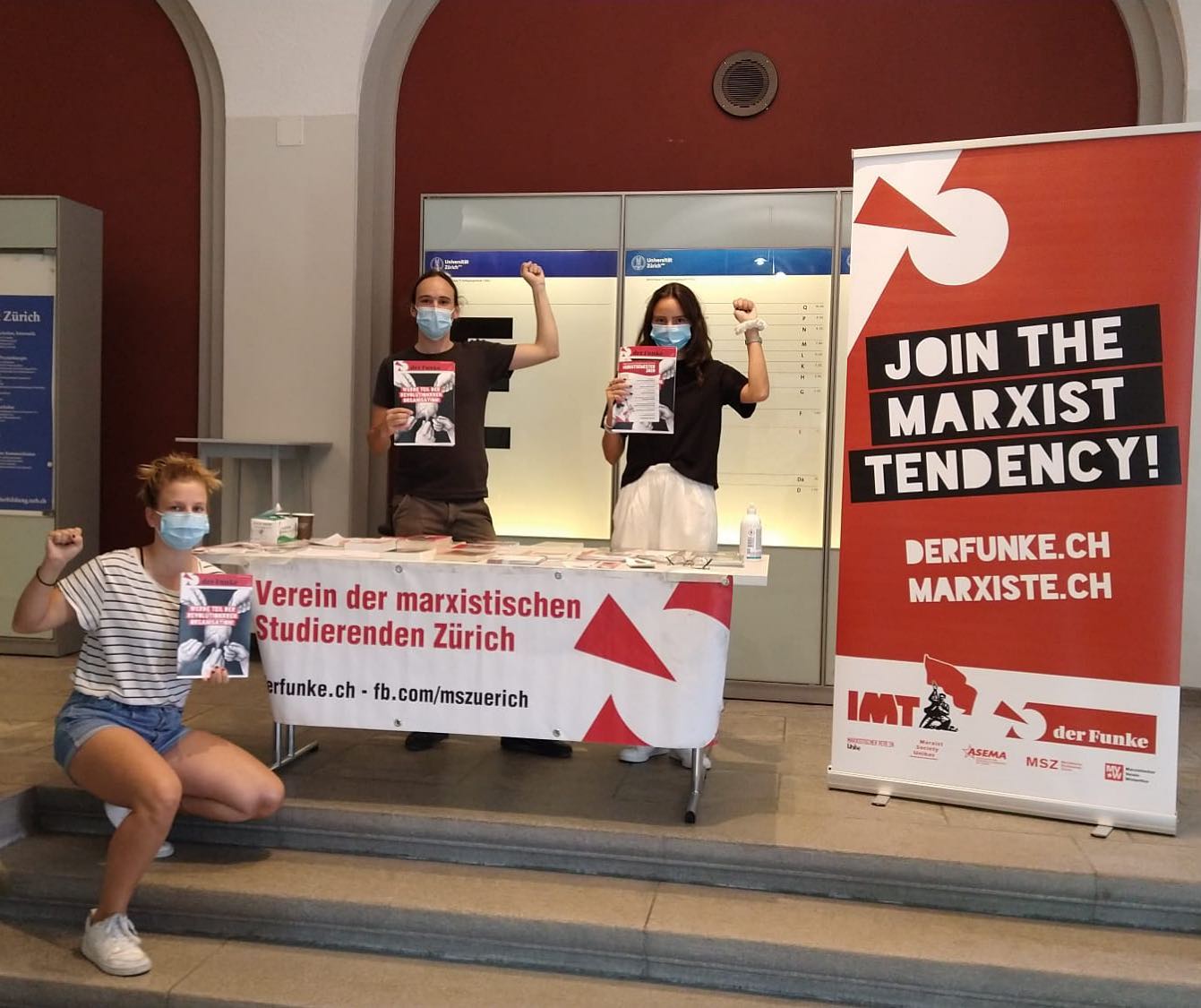 Die Marxistischen Studierenden Zürich haben zu Beginn des Semesters mit einer Stand- und verschiedenen Flyeraktionen das Gespräch mit den Studenten, zu den Themen Kapitalismus, Corona, BLM, Frauenstreik oder Klimastreik, gesucht. Trotz den schwierigen Umständen wegen der Pandemie, gelang es uns, mit vielen Studierenden zu diskutieren und ihr Interesse für unsere Organisation und revolutionäre Ideen zu wecken. Für viele Studierenden ist klar, dass der Kapitalismus überwunden werden muss, was aus den Gesprächen mit ihnen ersichtlich wurde. Aus diesem Grund haben wir viele Besucher und Interessentinnen an unseren Veranstaltungen begrüssen können.