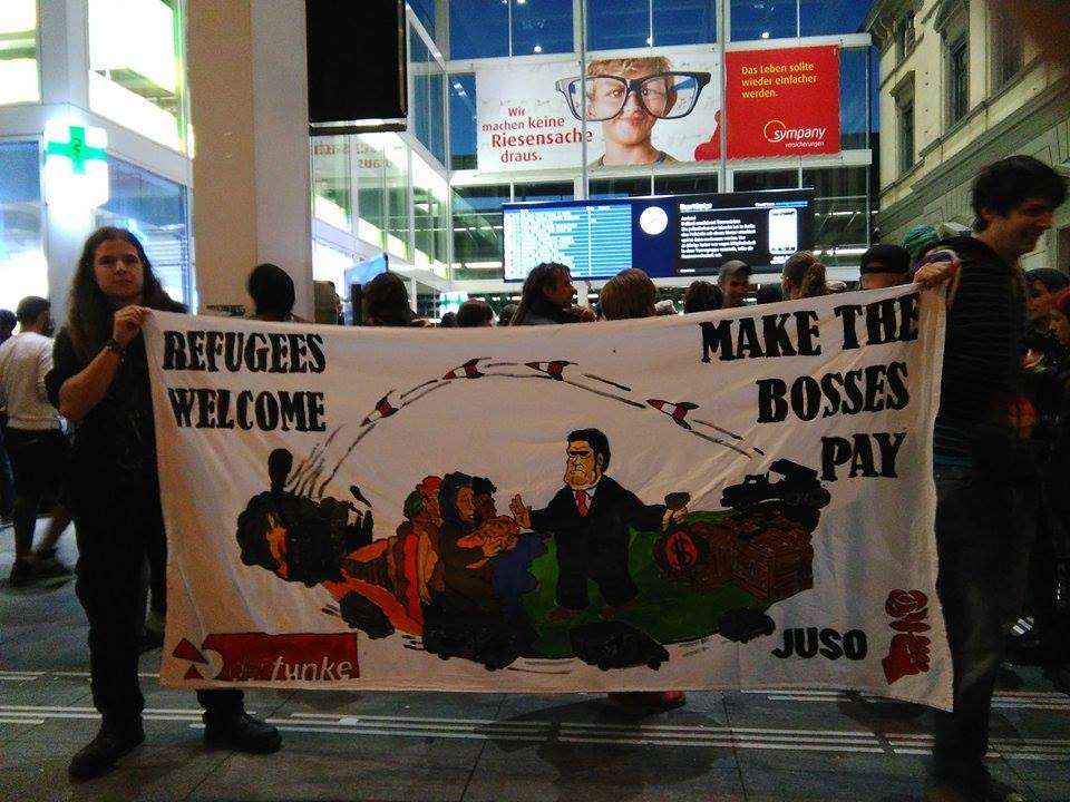 Zweitens müssen die politischen Argumente entwickelt und verfeinert werden. Der grundlegende menschliche Solidaritätsinstinkt ist ein guter Ausgangspunkt, aber wir müssen auch in aller Schärfe die in den rassistischen, bürgerlich-kapitalistischen Medien aufgeworfene Frage beantworten: Wer soll das bezahlen? Es muss uns absolut klar sein: Die herrschende Klasse nutzt nach wie vor die Frage der Migration und Flüchtlinge um die arbeitende Klasse zu spalten und MigrantInnen zum Sündenbock für ihre brutale Austeritätspolitik zu machen. Wir sagen dazu NEIN. Die Flüchtlinge sind willkommen und die Kapitalisten, Bänker und Rüstungsfabrikanten sollen zahlen. Wenn sie Billionen auftreiben konnten, um Banken zu retten, warum soll es dann nicht möglich sein, Milliarden aufzutreiben, um Flüchtlinge willkommen zu heissen.