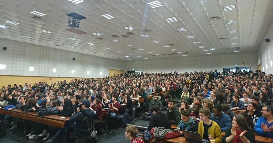 Am gestrigen 9. April hat die Leitung der Universität von Nanterre (Paris) zwei Einheiten der Bereitschaftspolizei CRS zum Einsatz in einem großen Hörsaal herbeigerufen und die gewaltsame Räumung einer Versammlung von etwa 100 Studierenden angeordnet. Dabei wurden sieben Studierende festgenommen. Sechs von ihnen befinden sich noch in Haft, darunter auch der Genosse Andréas Coste und der Genosse Victor Méndez (siehe Foto). Es ist klar, dass die Polizei mit den Festnahmen gezielt gegen die treibenden Kräfte der Protestbewegung vorgegangen ist.