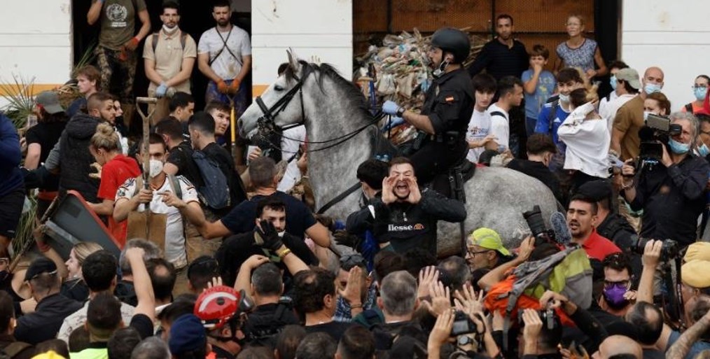 Das kriminelle Missmanagement der herrschenden Klasse war offensichtlich. Nach Jahrzehnten von Krise, Sparmassnahmen, unzähligen Demonstrationen und Massenbewegungen ist die Gota fría der letzte Tropfen in einem langen Prozess von angestauter Wut und Enttäuschung. Die ganze herrschende Clique – von der Königsfamilie über Sánchez bis Mazón – wird zutiefst verachtet. Das neue Ausmass des Autoritätsverlusts dieser Mörder zeigte sich, als sie für ein paar Soli-Fotos in die Stadt Paiporta einreisten. Die wütende Meute beschimpfte sie und beschmiss sogar die Königsfamilie mit Schlamm! «Mörder», «wo wart ihr», «niemand hat uns gewarnt», schrie die Menge. Ein Mann bot seine Schaufel demonstrativ König Felipe VI an (siehe Bild). Ihre Politik tötete seine Freunde und Verwandten. Auch die Massendemonstration von mehr als 200’000 eine Woche später triefte von Hass auf die Regierung: «Es sind keine Tote, sondern Ermordete!», «Mazón, Rücktritt», «Während du am essen warst, sind die Leute gestorben!».