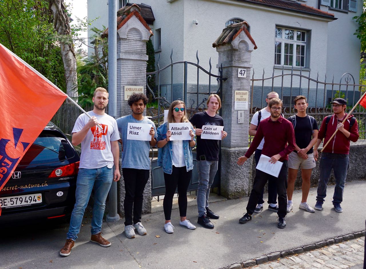 An einer Solidaritätskundgebung vor der pakistanischen Botschaft forderten am Mittwochmittag mehrere Aktivistinnen und Aktivisten der JUSO und verschiedenen Gewerkschaften die Freilassungen der Verhafteten sowie Information über ihren Aufenthaltsort. Trotz vorheriger Anmeldung waren weder der Botschafter noch sein Stellvertreter verfügbar, um einen Brief mit den Namen der Verhafteten entgegenzunehmen. «Der Botschafter wusste, dass wir kommen. Aber offensichtlich misst er den Menschenrechten seiner Landsleute keine Bedeutung zu» sagt Kevin Wolf, Vorstandsmitglied der JUSO Stadt Bern. Die Forderungen könnten per Post gesendet werden, teilte ein Botschaftsmitarbeiter mit.