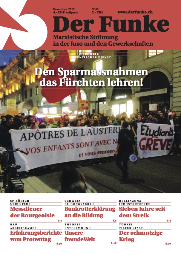 Aber auch in der Schweiz haben Kämpfe gegen die Auswirkungen der Krise stattgefunden und weitere zeichnen sich ab. Die Sparmassnahmen, welche mittlerweile fast alle Kantone erschüttern, stossen vermehrt auf Widerstand. In mehreren Kantonen organisieren sich die KantonsschülerInnen gegen den Abbau in der Bildung. In Luzern und Genf gab es bereits Demonstrationen von SchülerInnen, aber auch in Basel-Land, Schaffhausen und Winterthur formiert sich Widerstand. Die Speerspitze im Kampf gegen Sparmassnahmen stellt im Moment der Kanton Genf dar, wo der öffentliche Sektor Mitte November einen dreitägigen Streik durchgeführt hat, welcher in gewissen Bereichen bis zu 90% Streikbeteiligung hatte. Es ist nun an den Gewerkschaften und der SP/Juso diese Kämpfe zu verallgemeinern und zu einem gesamtschweizerischen Kampf gegen die Austerität zu vereinen. Nur so können wir der föderalistischen Salamitaktik der Bürgerlichen Paroli bieten und unsere Errungenschaften verteidigen.