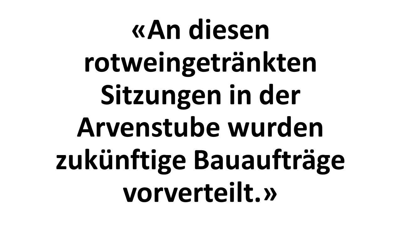 An diesen rotweingetränkten Sitzungen in der Arvenstube wurden zukünftige Bauaufträge vorverteilt. Die Firma, die den Auftrag vom Kartell erhielt, reichte dann eine um das 1.5-fache überteuerte Offerte ein und setzte sich im “Wettbewerb” trotzdem durch – die anderen reichten nämlich noch viel höhere Offerten ein. BDP-Regierungsrat Parolini betont jetzt, dass er, als er als Gemeindepräsident im Unterengadin auf das Kartell hingewiesen wurde, die wichtigsten Steuerzahler der Region mehrmals ermahnt habe, dass Preisabsprachen nicht in Ordnung seien; zur Überraschung aller vergebens.