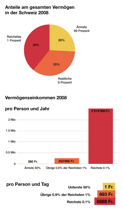 Den Reichen in der Schweiz geht es in der Krise gut. Sogar immer besser. So sind im letzten Jahr die Vermögen der 300 Reichsten um 6.5 Prozent oder umgerechnet um 31,1 Milliarden Franken angestiegen. Hauptgrund für diesen Anstieg waren kräftige Kursgewinne an den Aktienmärkten. Wer hat, dem wird gegeben. Alleine die zehn Reichsten der Schweiz wurden im Jahr 2012 um 21 Milliarden Franken reicher. Zusammen besitzen sie ein Vermögen von 141 Milliarden. Während die Beschäftigten und die RentnerInnen durch stagnierende Löhne, höhere Krankenkassenprämien, horrende Mieten und steigende Gebühren immer weniger Geld im Geldbeutel haben. Wie in ganz Europa sollen sie die Zeche für die Wirtschaftskrise zahlen. In der Schweiz zurzeit vor allem in Form von Sparprogrammen der öffentlichen Hand.