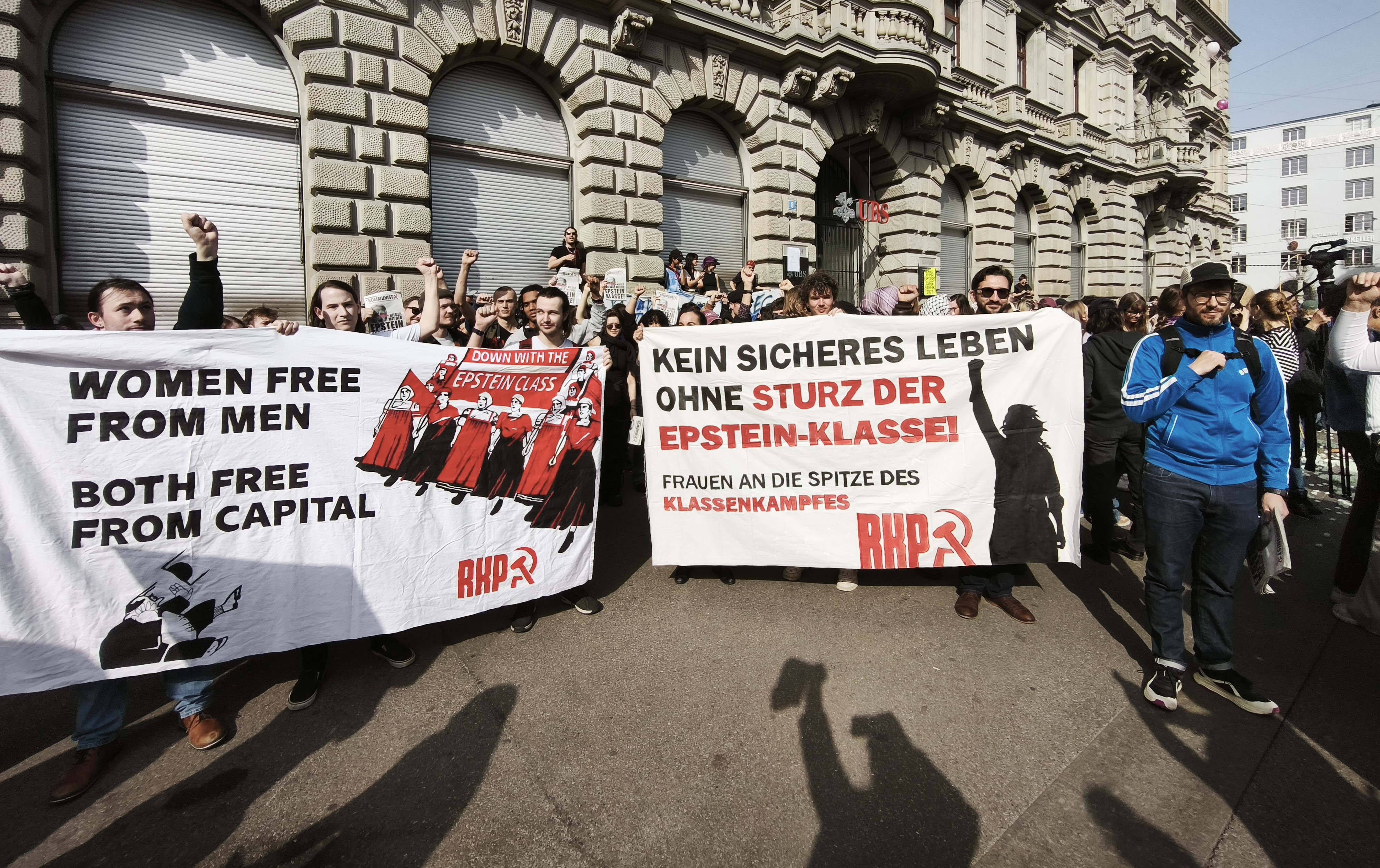 In Bern kamen wir direkt als Mini-Demoblock an und skandierten Parolen wie «Down with the Epstein class – Unity in our class!». Der Epstein-Slogan war für viele ein Magnet. Zwei ältere Frauen drückten uns spontan Geld in die Hand – 10 und 50 Franken. Eine meinte: «Ich bin apolitisch, aber ihr habt 100 % recht. Es läuft eine Verschwörung der Reichen gegen uns. Sie kontrollieren die Politik, nicht umgekehrt. Ihr gebt mir Zuversicht in die Jugend.» In Genf sagte eine junge Frau empört: «Schön gibt es euch. Endlich spricht jemand darüber – alle anderen Medien sagen nichts!» Für uns Kommunisten ist klar, dass die Frauenbefreiung nur möglich ist mit dem Sturz der herrschenden Klasse und ihrem Staat. Der Epstein-Skandal machte diese Schlussfolgerung für Millionen von normalen Menschen weltweit greifbarer.