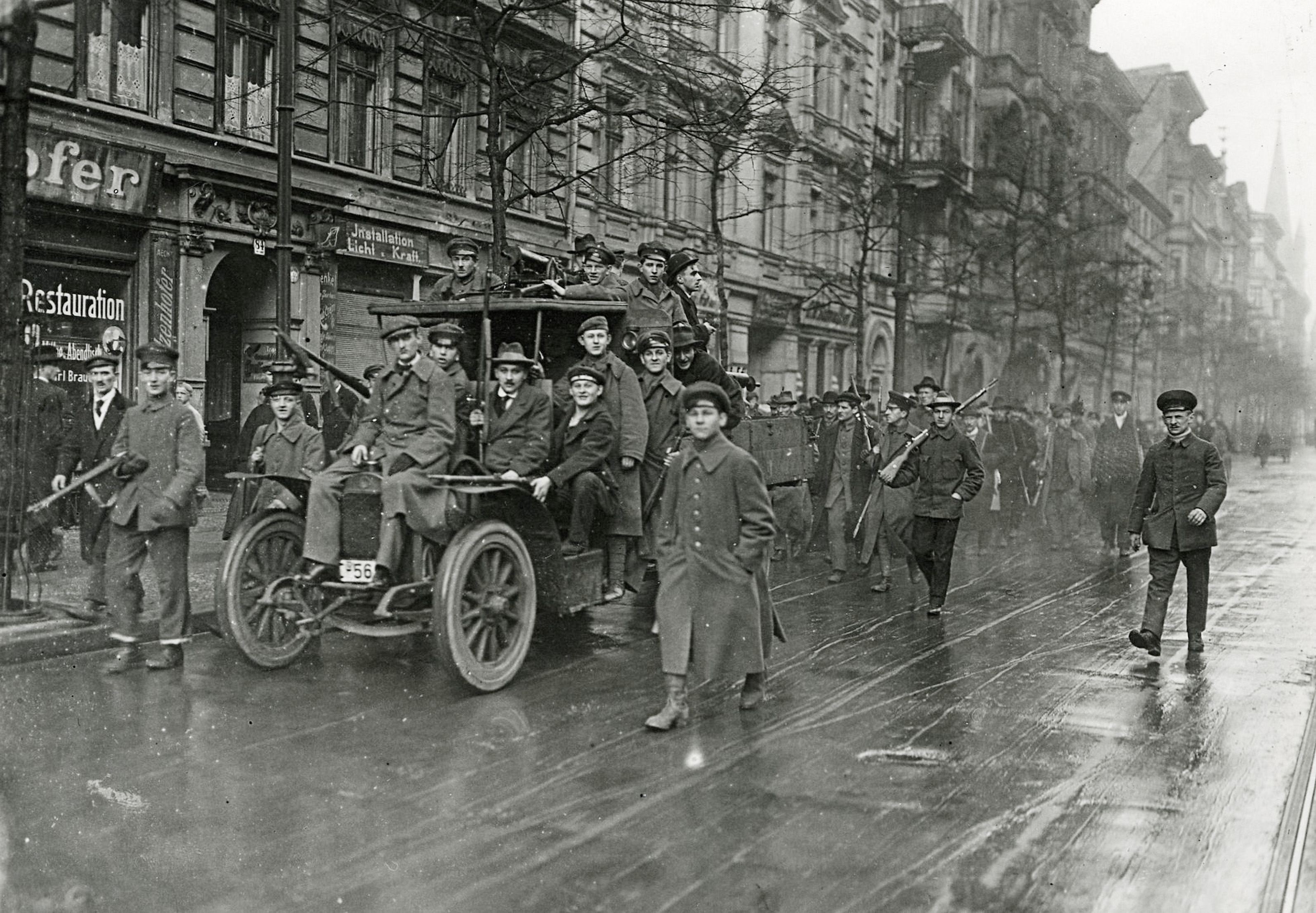 Die Meuterei der Kieler Matrosen im November 1918 war der Funke, welcher das Feuer der Revolution entfachte. Die Revolution eroberte das ganze Land im Sturm: In so gut wie allen Industriestädten des alten Kaiserreichs waren nun ArbeiterInnen- und Soldatenräte an der Macht. Die «Novemberrevolution» stürzte die Monarchie; der Kaiser floh.