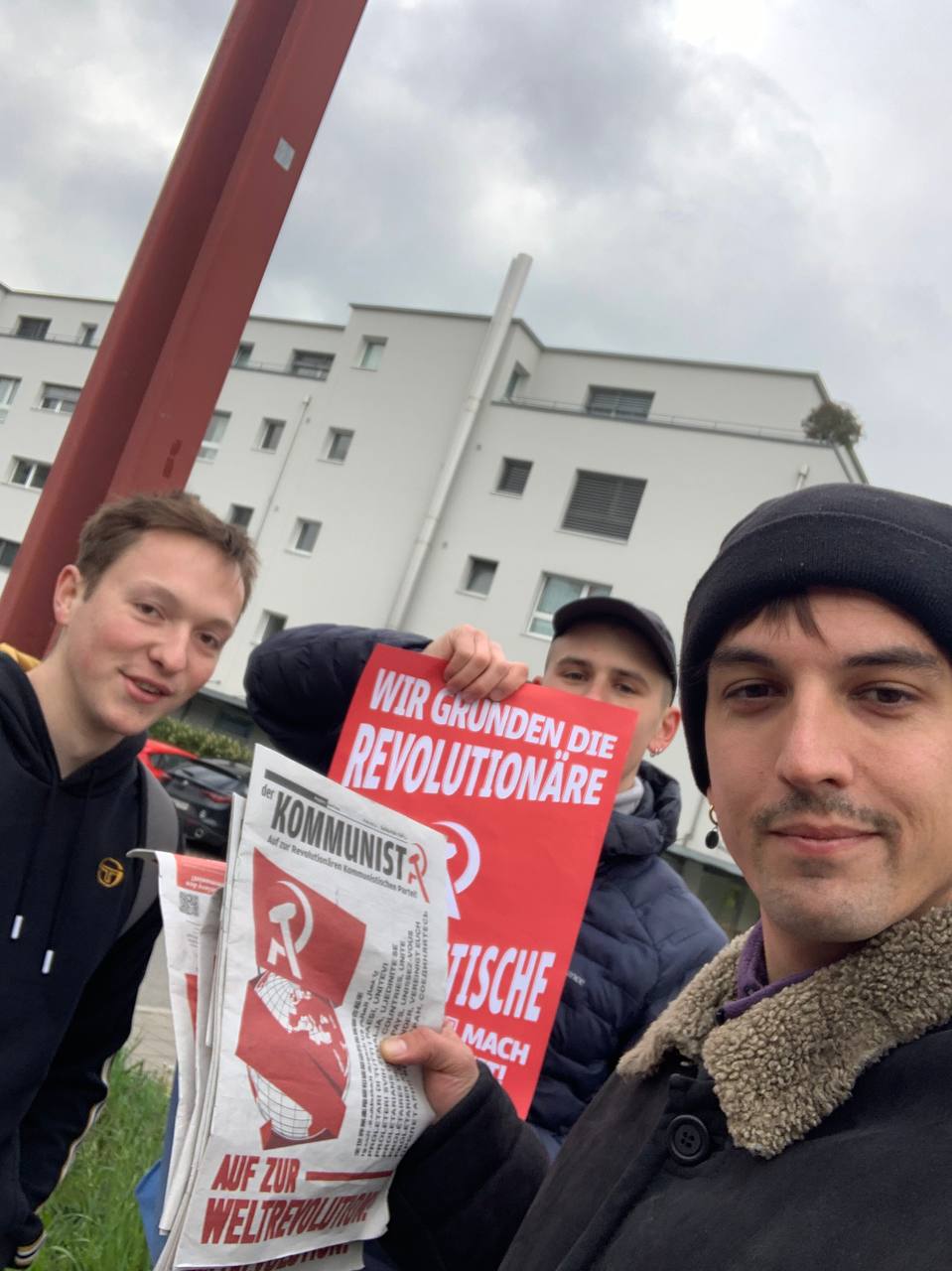 Oli, der gerade mit der Arbeit fertig war, hat von weitem unsere Zeitung gesehen, kam in seinen Büezer-Klamotten auf uns zu und fragte, ob er so eine haben könne. Er hat unsere Plakate oft gesehen und ist „gwundrig über das, was da neues brodelt“. Er wählte bis anhin am ehesten PdA und ist richtig angepisst mit seinen Arbeitsbedingungen und der Welt. Wir haben u.a. über „umverteilen oder enteignen“ diskutiert und er wollte wissen, was uns von der PdA und anderen linken Parteien unterscheidet. Da waren wir zu schwammig. Die Antwort steckt glasklar im RKP-Manifest – speziell in der Einleitung! Genosse Böbbu wird das am Telefon nachholen. Oli musste weg, gab uns 20 CHF für die Zeitung und ist sehr interessiert, am Gründungskongress teilzunehmen.